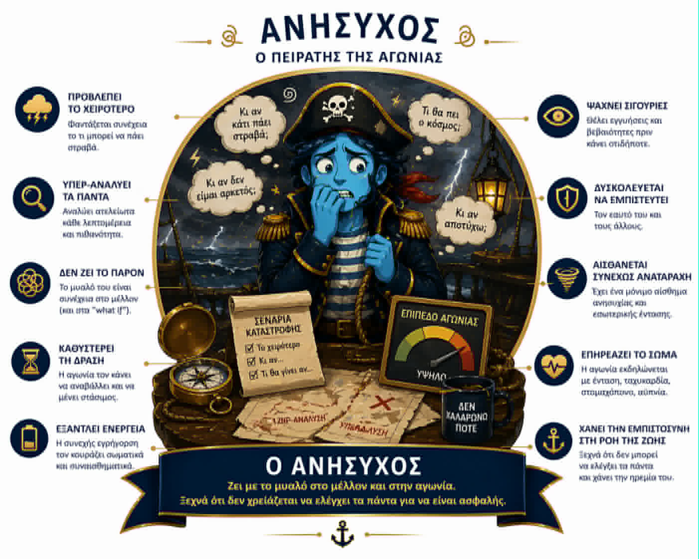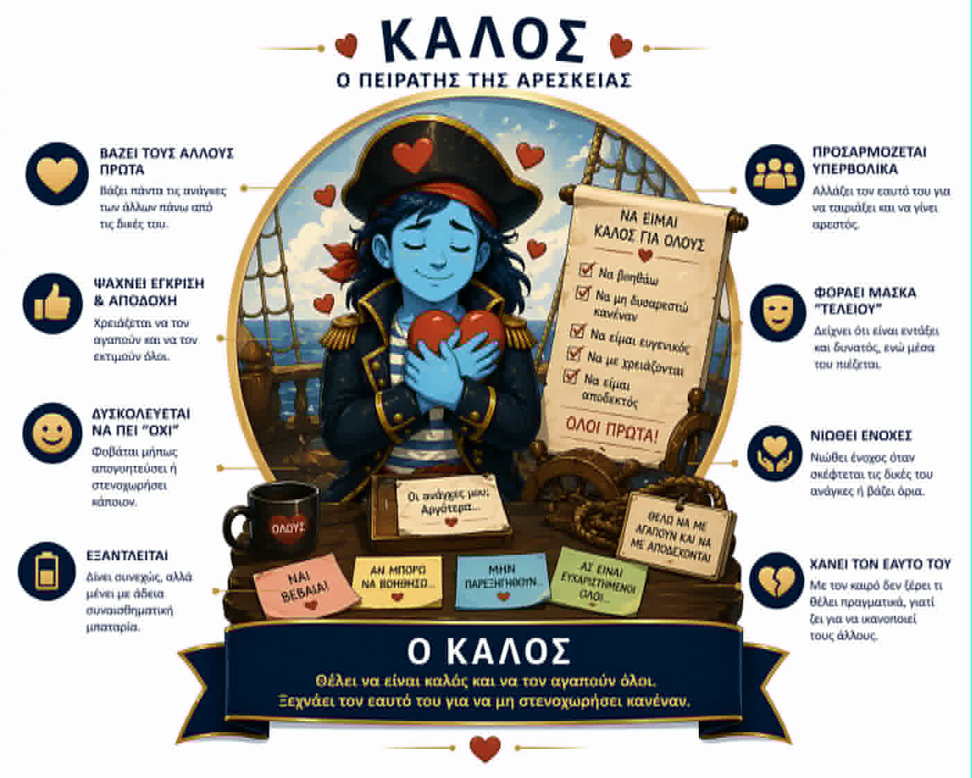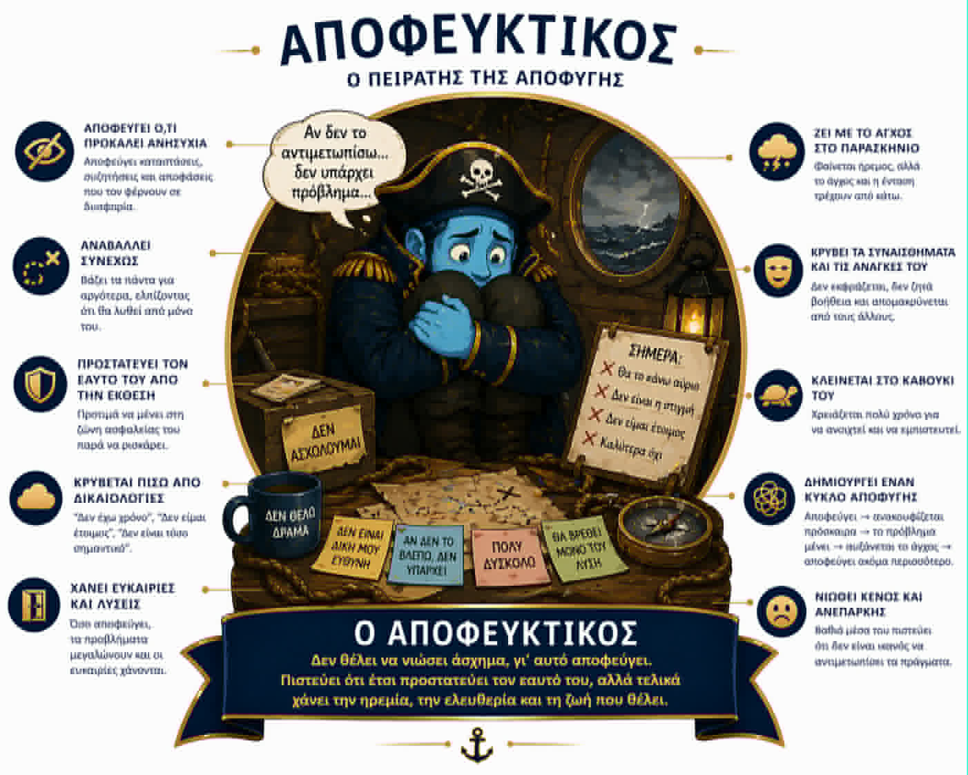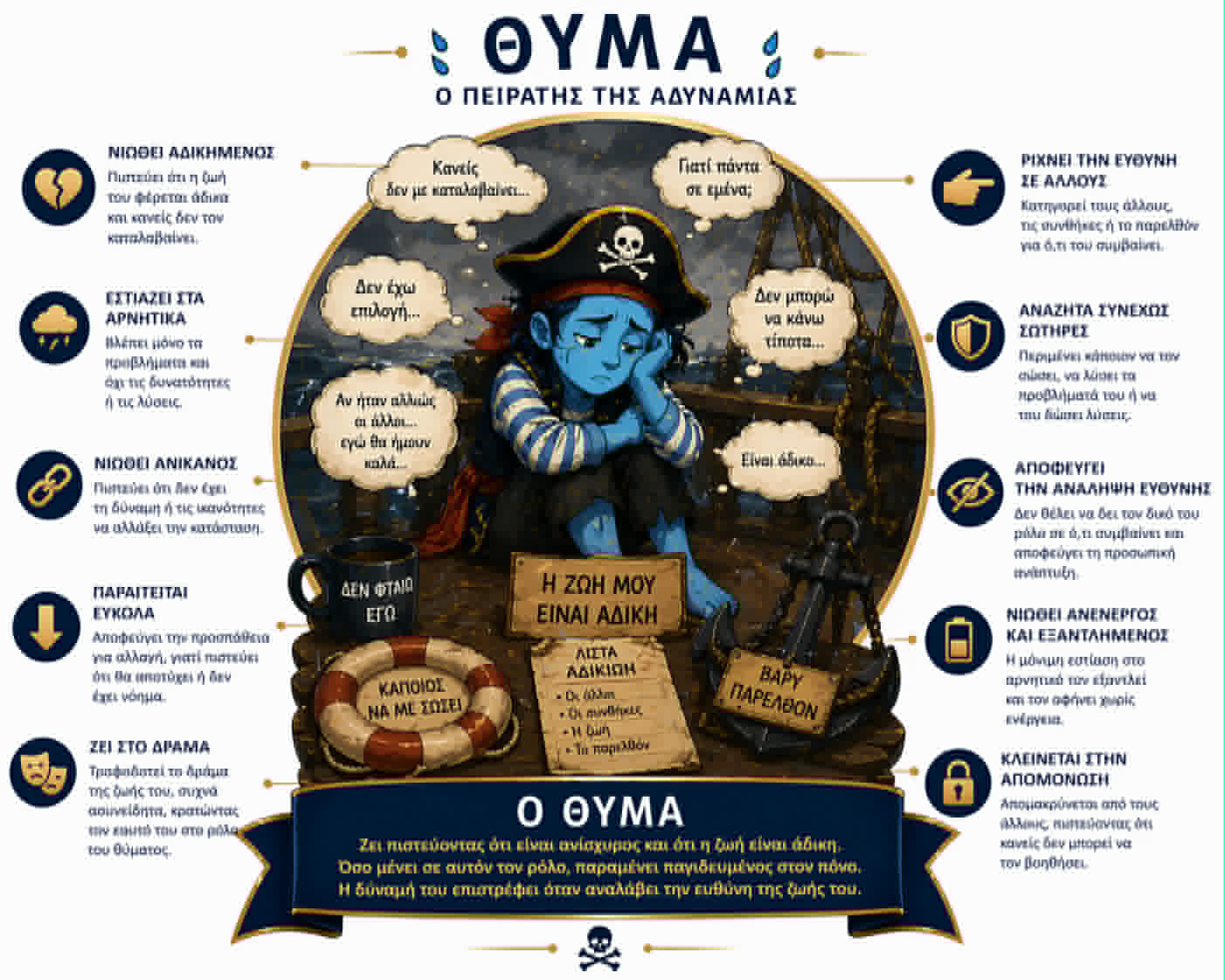 Οι βασικοί πειρατές που ελέγχουν το νου σου γεννήθηκαν στην παιδική ηλικία σου με σκοπό να σε προστατέψουν από τον συναισθηματικό πόνο. Από τότε σε ακολουθούν και παίρνουν τον έλεγχο σε κάθε δύσκολη στιγμή. Ενισχύουν τα αρνητικά συναισθήματα και σε εμποδίζουν από το να δρας με επιλογή.