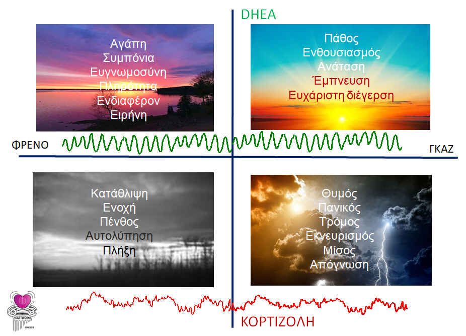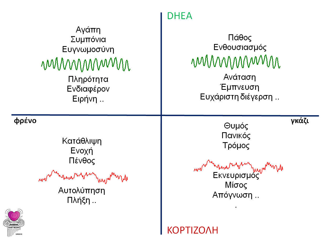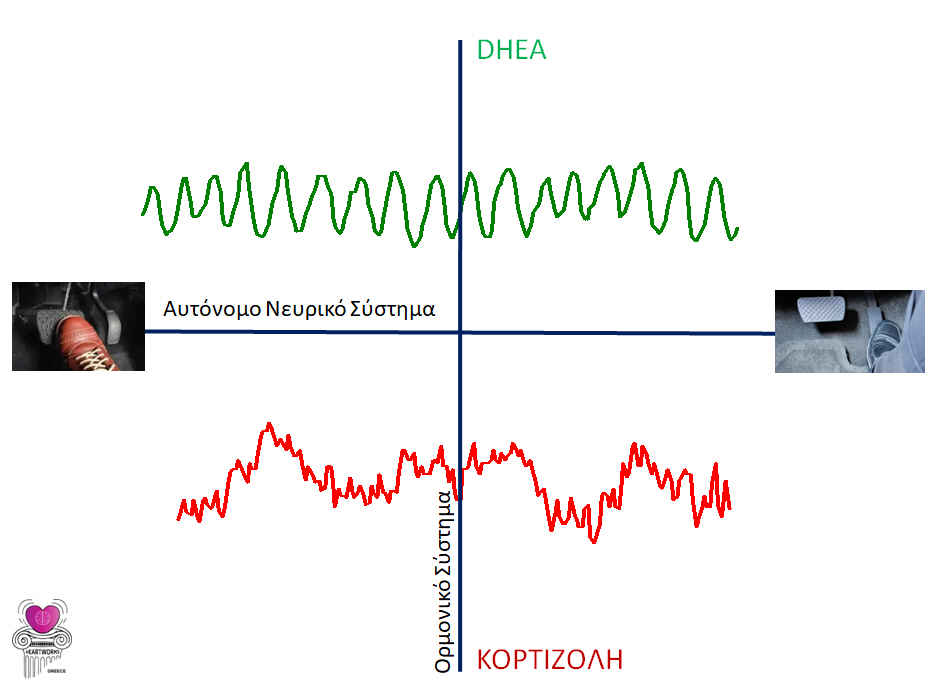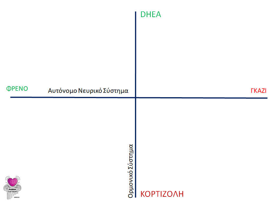 Ο κάθετος άξονας αποτυπώνει το ορμονικό επίπεδο, με την κορτιζόλη χαμηλά και τη DHEA ψηλά.