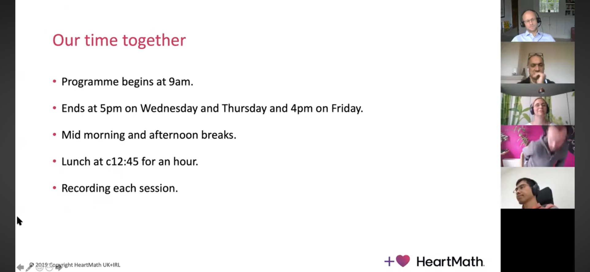 Το απόσπασμα δείχνει την έναρξη μιας online εκπαίδευσης με έντονη έμφαση στο πλαίσιο, τη σαφήνεια και τη συνοχή της ομάδας. Ο συντονιστής εξηγεί ότι όλες οι συνεδρίες θα ηχογραφούνται και θα αποστέλλονται καθημερινά, ώστε οι συμμετέχοντες να νιώθουν ασφαλείς ακόμα και αν χρειαστεί να απουσιάσουν.