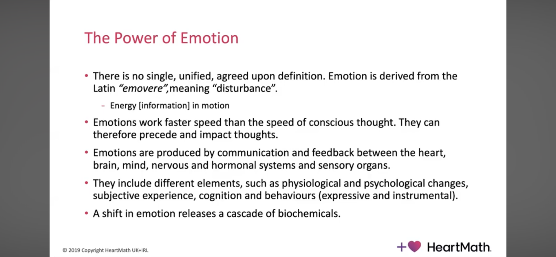 Τέλος, σε ερώτηση για τη σχέση σκέψης–συναισθήματος, ο εισηγητής επιμένει ότι δεν είναι χρήσιμο να το κάνουμε γραμμικό: όλα λειτουργούν ως σύστημα και η φυσιολογία συχνά καθορίζει το "baseline" που γεννά σκέψεις και συναισθήματα. Η πρακτική συνοχής προτείνεται ως πρακτική είσοδος στο σύστημα (αναπνοή–σώμα–εστίαση–καλλιέργεια ευγνωμοσύνης/συμπόνιας). Διαχωρίζει επίσης το HeartMath από μορφές διαλογισμού που στοχεύουν στην αποσύνδεση: εδώ ο στόχος είναι να αποσυνδεθείς από μη βοηθητικά μοτίβα για να επανασυνδεθείς σκόπιμα με πιο λειτουργική κατάσταση και συμπεριφορά.