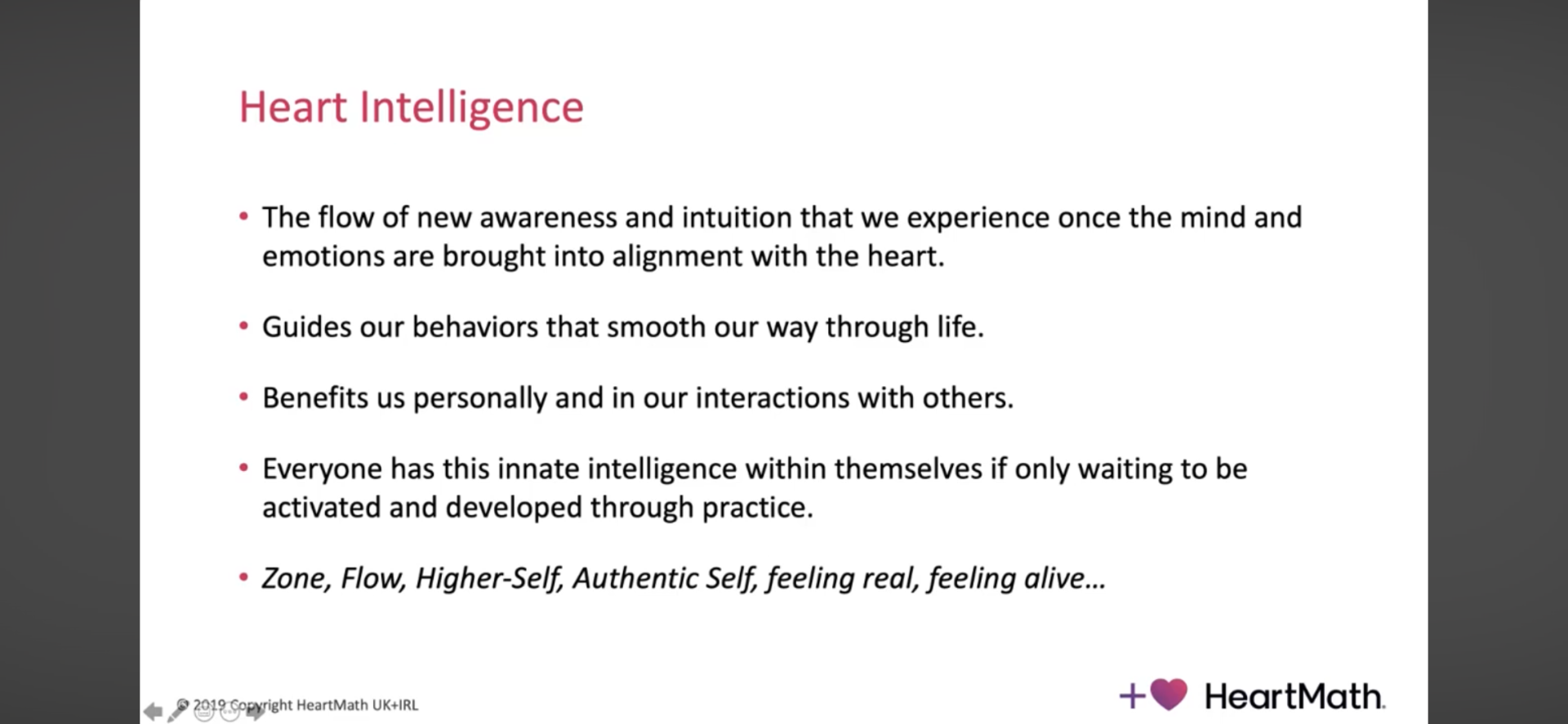 Η ενότητα εξηγεί ότι η πρακτική της συνοχής δεν βελτιώνει μόνο τη ρύθμιση στρες, αλλά αυξάνει την πρόσβαση σε μια λειτουργική κατάσταση που ονομάζεται «καρδιακή νοημοσύνη» (ή flow/zone/βασικός εαυτός). Το κεντρικό μήνυμα είναι ότι η ονομασία δεν έχει σημασία· αυτό που μετρά είναι η εμπειρία: όταν μειώνονται οι "παρεμβολές" (νοητικές, σωματικές, συναισθηματικές), γίνεται πιο καθαρό το σήμα από τον εαυτό, εμφανίζεται μεγαλύτερη αίσθηση σύνδεσης και είναι πιο προσβάσιμες η διαίσθηση και η ενόραση. Η συνοχή δεν φαίνεται μόνο σε βιοανάδραση αλλά μεταφράζεται σε συμπεριφορά: περισσότερη ευκολία/ροή, καλύτερη σχέση με τους άλλους, αυθεντική παρουσία που γίνεται αντιληπτή.